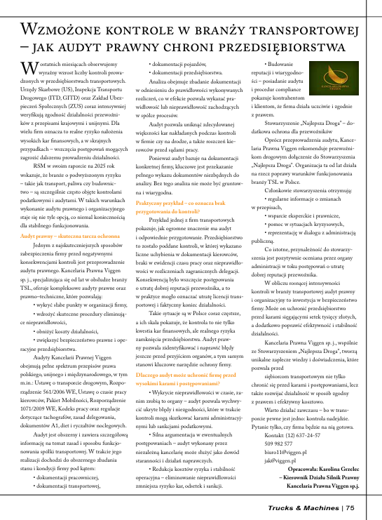 Z przyjemnością informujemy, że w najnowszym, październikowym wydaniu czasopisma Truck & Machines ukazał się artykuł autorstwa Pani Karoliny Grzelec – prawnika, Kierownika Działu Prawnego Kancelarii Prawnej Viggen sp. j.