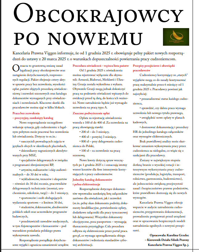 Artykuł „Obcokrajowcy po nowemu” omawia nowy, kompleksowy pakiet regulacyjny, który zastępuje dotychczasowe, rozproszone przepisy jednym spójnym systemem. Autorka wyjaśnia, że zmiany nie mają charakteru wyłącznie kosmetycznego, lecz oznaczają gruntowną przebudowę zasad zatrudniania cudzoziemców, w tym wprowadzenie zamkniętych katalogów wyjątków, nowych opłat oraz pełnej elektronizacji procedur. Pakiet obejmuje cztery kluczowe akty wykonawcze regulujące pracę bez zezwolenia, wysokość opłat, wykaz państw objętych procedurą oświadczeniową oraz jednolity katalog dokumentów wymaganych przy oświadczeniach i zezwoleniach.